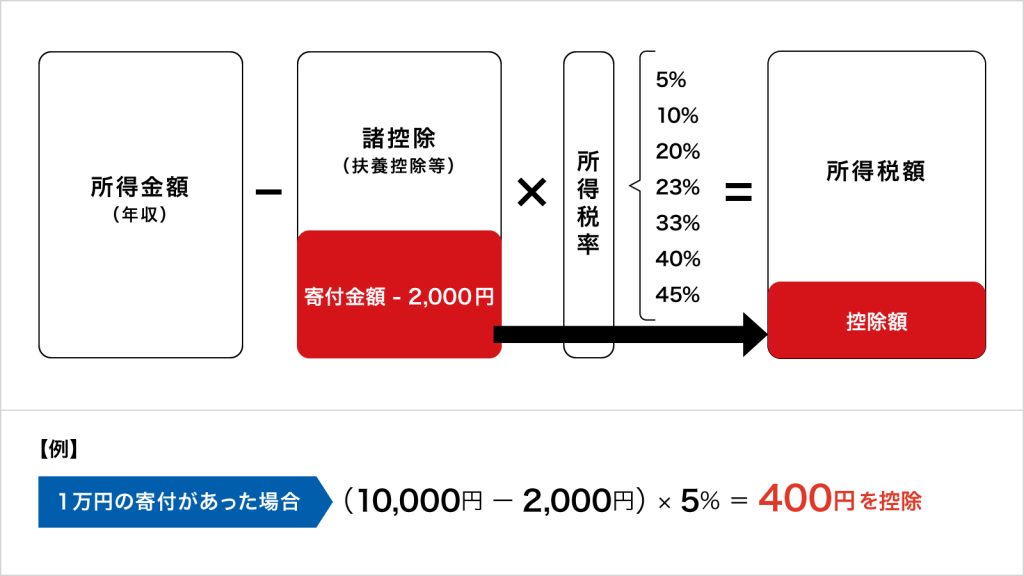 (寄付金額-2,000円)×税率5%から45%=寄付金控除額