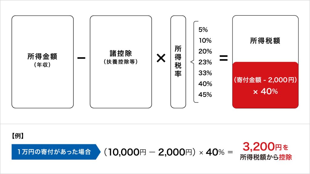 (寄付金額-2,000円)×税率40%(一律)=寄付金控除額
