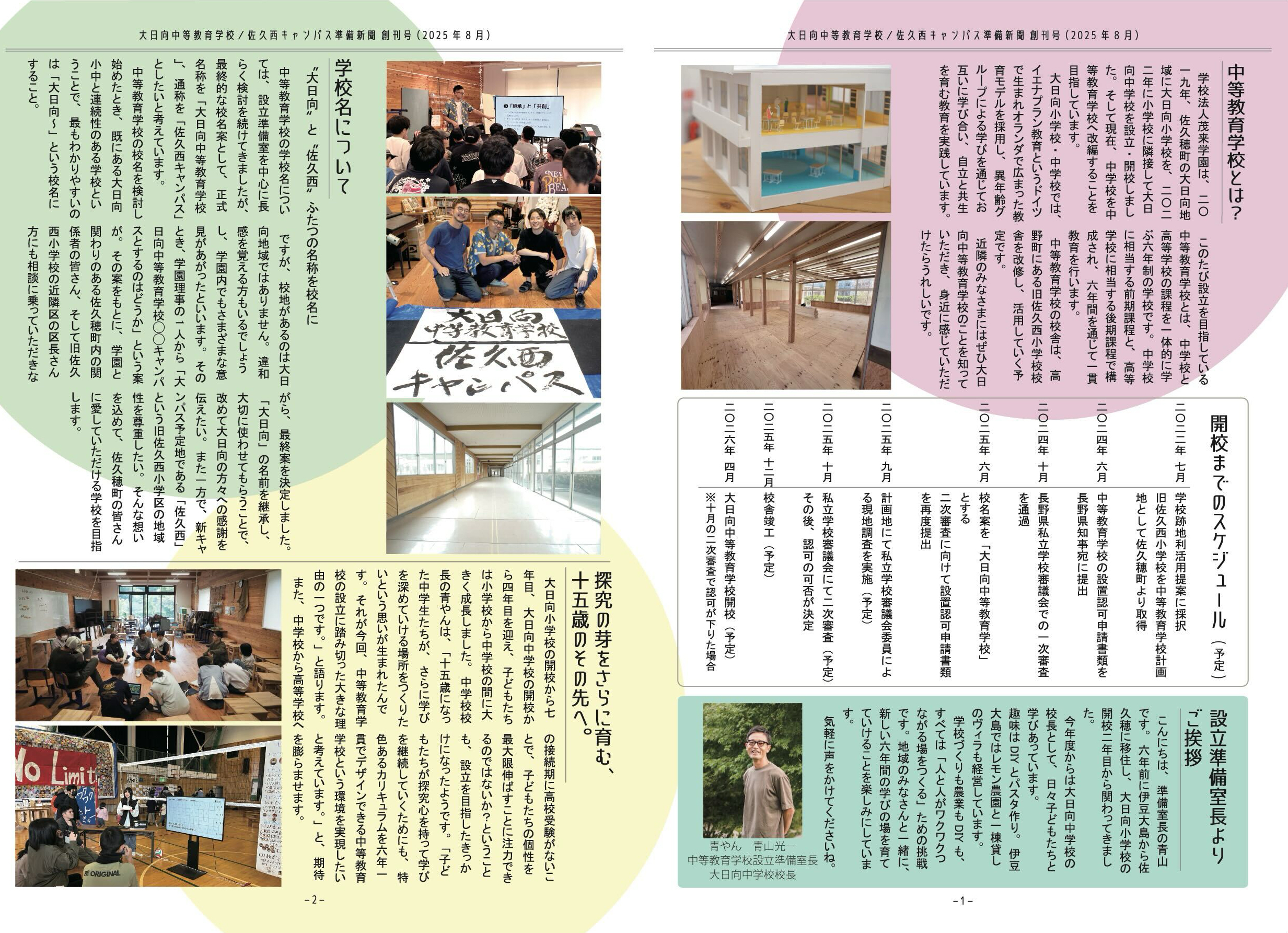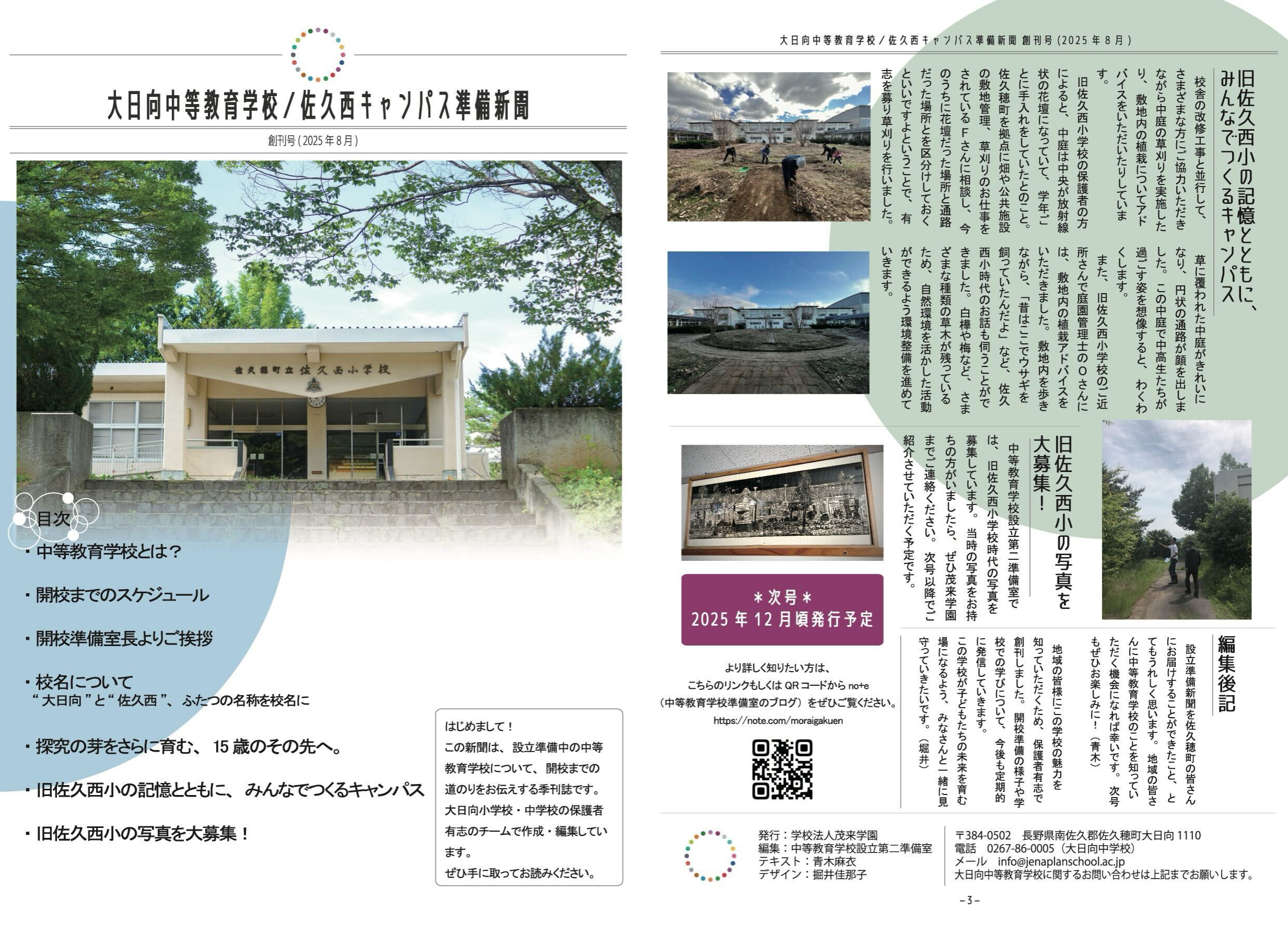 大日向小学校・中学校の保護者有志の皆さんにもお手伝いいただいており、このたび、その成果のひとつがこちらの「大日向中等教育学校/佐久西キャンパス準備新聞」として形になりました。